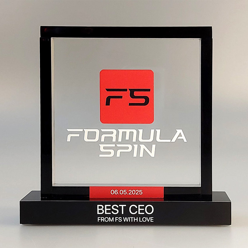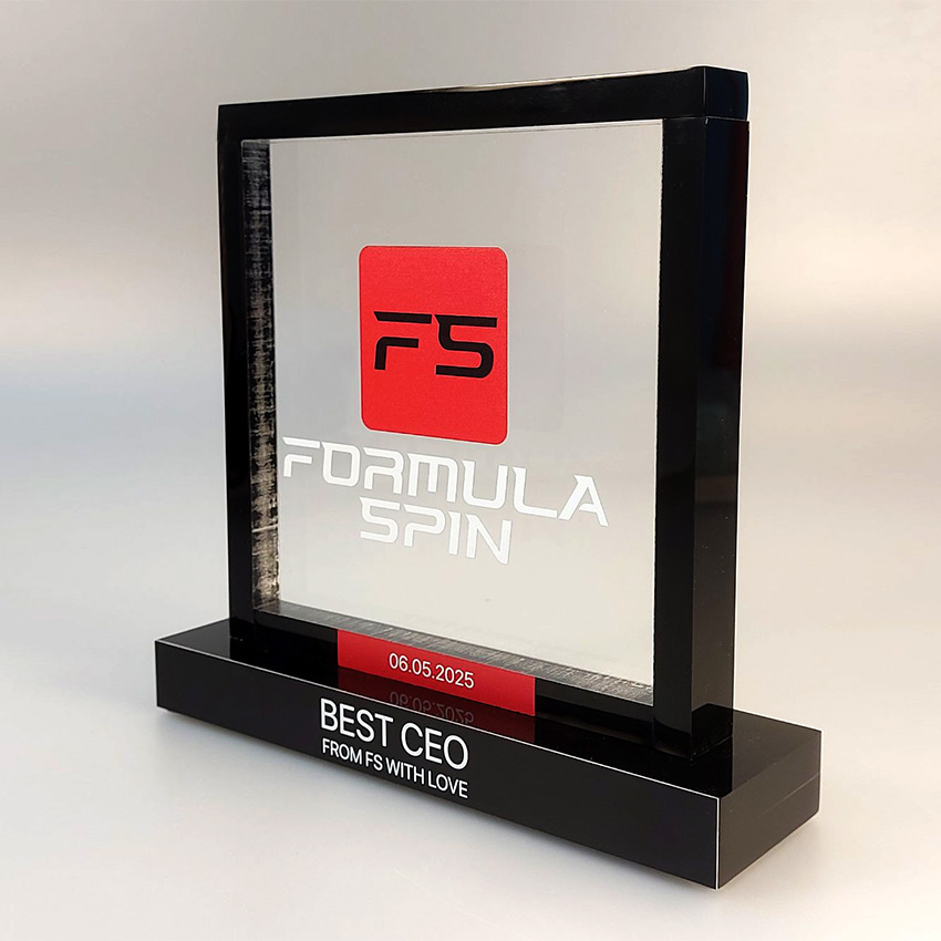 Акрилова нагорода Formula Spin — елегантне поєднання чорного та прозорого акрилу, що створює ефектний і сучасний вигляд. Виготовлена з високоякісних матеріалів: прозорий акрил товщиною 20 мм з ультрафіолетовим друком логотипа на вертикальній частині, чорний акрил для підставки та кайми (10-20 мм). Номінація надрукована на чорному металі, що додає нагороді стильного акценту.