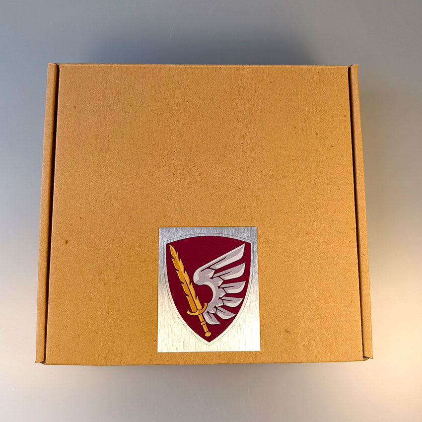 Упаковка: Кожен виріб надійно упакований у захисну коробку. На верхній частині коробки прикріплено мініатюрне зображення шеврона для зручної ідентифікації.